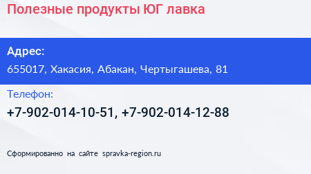 Полезные продукты-ЮГ, лавка по адресу 655017, Хакасия, Абакан, Чертыгашева, 81 в дальнейшем Организация, размещена в следующих категориях: