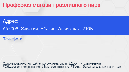 Профсоюз, магазин разливного пива по адресу 655009, Хакасия, Абакан, Аскизская, 210Б в дальнейшем Организация, размещена в следующих категориях: