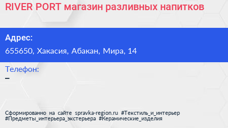 RIVER PORT, магазин разливных напитков по адресу 655650, Хакасия, Абакан, Мира, 14 в дальнейшем Организация, размещена в следующих категориях: