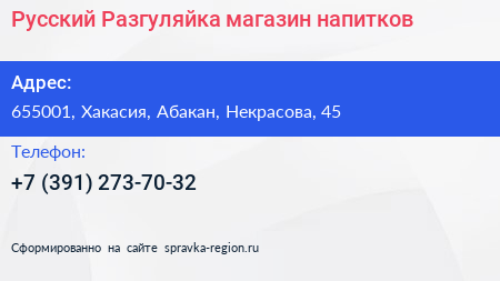 Русский Разгуляйка, магазин напитков по адресу 655001, Хакасия, Абакан, Некрасова, 45 в дальнейшем Организация, размещена в следующих категориях:
