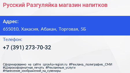 Русский Разгуляйка, магазин напитков по адресу 655010, Хакасия, Абакан, Торговая, 5Б в дальнейшем Организация, размещена в следующих категориях: