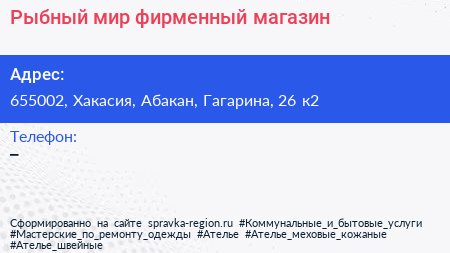 Рыбный мир, фирменный магазин по адресу 655002, Хакасия, Абакан, Гагарина, 26 к2 в дальнейшем Организация, размещена в следующих категориях: