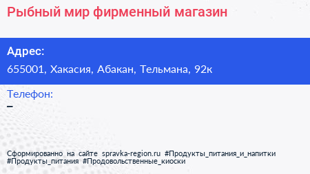 Рыбный мир, фирменный магазин по адресу 655001, Хакасия, Абакан, Тельмана, 92к в дальнейшем Организация, размещена в следующих категориях: