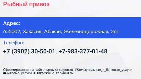 Рыбный привоз по адресу 655002, Хакасия, Абакан, Железнодорожная, 26г в дальнейшем Организация, размещена в следующих категориях:
