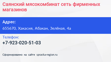 Саянский мясокомбинат, сеть фирменных магазинов по адресу 655670, Хакасия, Абакан, Зелёная, 4а в дальнейшем Организация, размещена в следующих категориях: