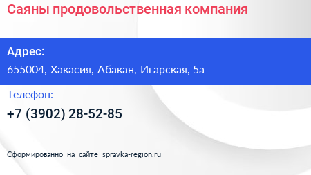 Саяны, продовольственная компания по адресу 655004, Хакасия, Абакан, Игарская, 5а в дальнейшем Организация, размещена в следующих категориях: