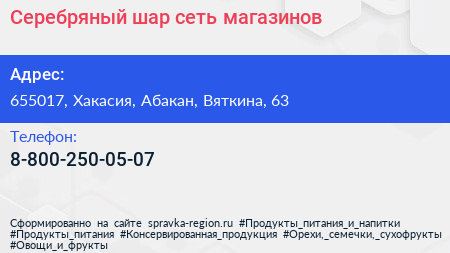 Серебряный шар, сеть магазинов по адресу 655017, Хакасия, Абакан, Вяткина, 63 в дальнейшем Организация, размещена в следующих категориях: