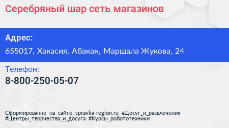 Серебряный шар, сеть магазинов по адресу 655017, Хакасия, Абакан, Маршала Жукова, 24 в дальнейшем Организация, размещена в следующих категориях:
