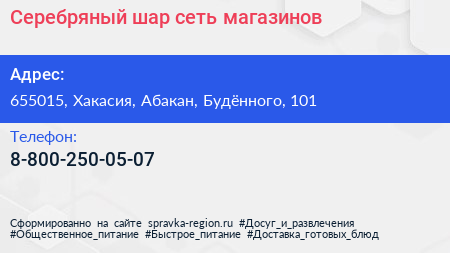 Серебряный шар, сеть магазинов по адресу 655015, Хакасия, Абакан, Будённого, 101 в дальнейшем Организация, размещена в следующих категориях: