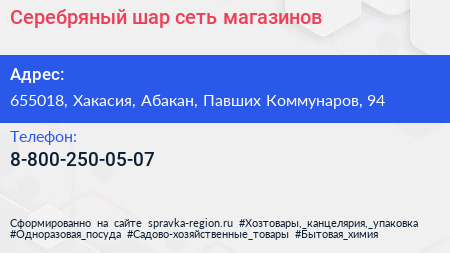 Серебряный шар, сеть магазинов по адресу 655018, Хакасия, Абакан, Павших Коммунаров, 94 в дальнейшем Организация, размещена в следующих категориях:
