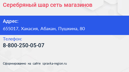 Серебряный шар, сеть магазинов по адресу 655017, Хакасия, Абакан, Пушкина, 80 в дальнейшем Организация, размещена в следующих категориях: