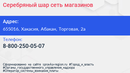 Серебряный шар, сеть магазинов по адресу 655016, Хакасия, Абакан, Торговая, 2а в дальнейшем Организация, размещена в следующих категориях: