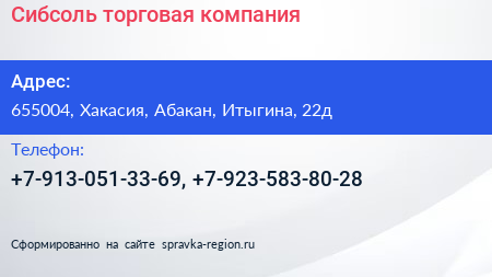 Сибсоль, торговая компания по адресу 655004, Хакасия, Абакан, Итыгина, 22д в дальнейшем Организация, размещена в следующих категориях: