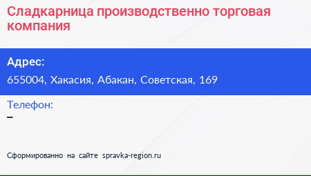 Сладкарница, производственно-торговая компания по адресу 655004, Хакасия, Абакан, Советская, 169 в дальнейшем Организация, размещена в следующих категориях:
