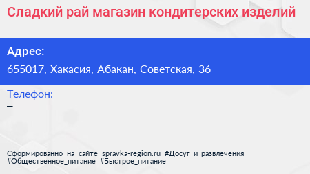 Сладкий рай, магазин кондитерских изделий по адресу 655017, Хакасия, Абакан, Советская, 36 в дальнейшем Организация, размещена в следующих категориях: