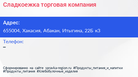 Сладкоежка, торговая компания по адресу 655004, Хакасия, Абакан, Итыгина, 22Б к3 в дальнейшем Организация, размещена в следующих категориях: