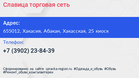 Славица, торговая сеть по адресу 655012, Хакасия, Абакан, Хакасская, 25 киоск в дальнейшем Организация, размещена в следующих категориях: