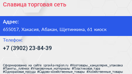 Славица, торговая сеть по адресу 655017, Хакасия, Абакан, Щетинкина, 61 киоск в дальнейшем Организация, размещена в следующих категориях: