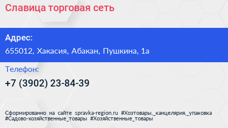 Славица, торговая сеть по адресу 655012, Хакасия, Абакан, Пушкина, 1а в дальнейшем Организация, размещена в следующих категориях: