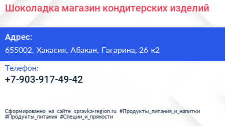 Шоколадка, магазин кондитерских изделий по адресу 655002, Хакасия, Абакан, Гагарина, 26 к2 в дальнейшем Организация, размещена в следующих категориях: