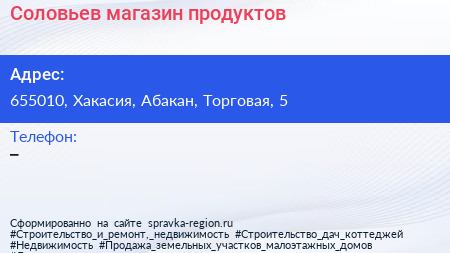 Соловьев, магазин продуктов по адресу 655010, Хакасия, Абакан, Торговая, 5 в дальнейшем Организация, размещена в следующих категориях:
