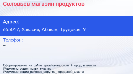 Соловьев, магазин продуктов по адресу 655017, Хакасия, Абакан, Трудовая, 9 в дальнейшем Организация, размещена в следующих категориях: