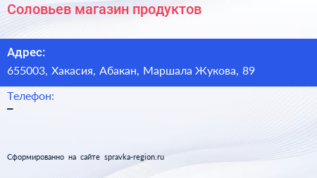 Соловьев, магазин продуктов по адресу 655003, Хакасия, Абакан, Маршала Жукова, 89 в дальнейшем Организация, размещена в следующих категориях: