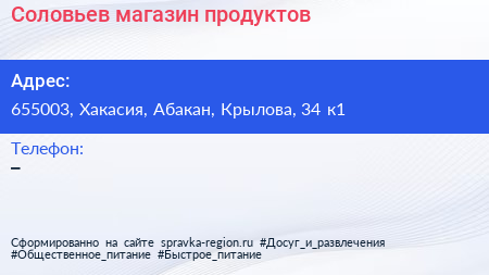 Соловьев, магазин продуктов по адресу 655003, Хакасия, Абакан, Крылова, 34 к1 в дальнейшем Организация, размещена в следующих категориях: