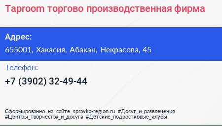 Taproom, торгово-производственная фирма по адресу 655001, Хакасия, Абакан, Некрасова, 45 в дальнейшем Организация, размещена в следующих категориях: