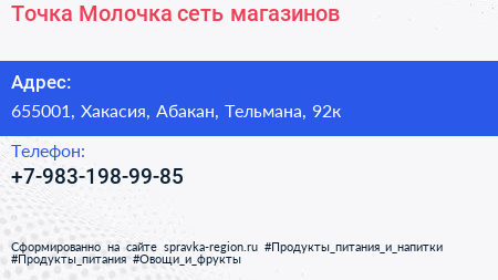 Точка Молочка, сеть магазинов по адресу 655001, Хакасия, Абакан, Тельмана, 92к в дальнейшем Организация, размещена в следующих категориях: