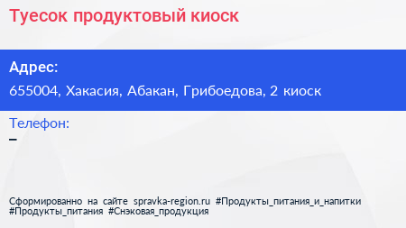 Туесок, продуктовый киоск по адресу 655004, Хакасия, Абакан, Грибоедова, 2 киоск в дальнейшем Организация, размещена в следующих категориях: