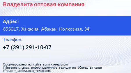 Владелита, оптовая компания по адресу 655017, Хакасия, Абакан, Колхозная, 34 в дальнейшем Организация, размещена в следующих категориях: