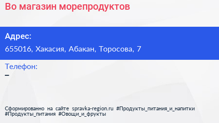 Во!, магазин морепродуктов по адресу 655016, Хакасия, Абакан, Торосова, 7 в дальнейшем Организация, размещена в следующих категориях: