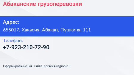 Абаканские грузоперевозки по адресу 655017, Хакасия, Абакан, Пушкина, 111 в дальнейшем Организация, размещена в следующих категориях: