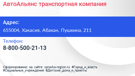 АвтоАльянс, транспортная компания по адресу 655004, Хакасия, Абакан, Пушкина, 211 в дальнейшем Организация, размещена в следующих категориях:
