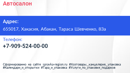 Автосалон по адресу 655017, Хакасия, Абакан, Тараса Шевченко, 83а в дальнейшем Организация, размещена в следующих категориях: