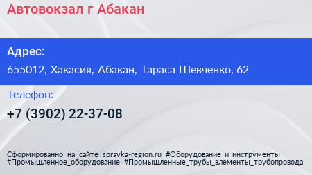 Автовокзал, г. Абакан по адресу 655012, Хакасия, Абакан, Тараса Шевченко, 62 в дальнейшем Организация, размещена в следующих категориях: