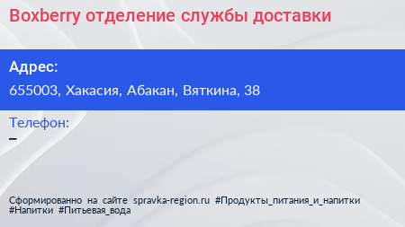 Boxberry, отделение службы доставки по адресу 655003, Хакасия, Абакан, Вяткина, 38 в дальнейшем Организация, размещена в следующих категориях: