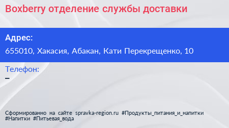 Boxberry, отделение службы доставки по адресу 655010, Хакасия, Абакан, Кати Перекрещенко, 10 в дальнейшем Организация, размещена в следующих категориях: