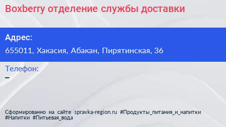 Boxberry, отделение службы доставки по адресу 655011, Хакасия, Абакан, Пирятинская, 36 в дальнейшем Организация, размещена в следующих категориях: