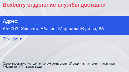 Boxberry, отделение службы доставки по адресу 655003, Хакасия, Абакан, Маршала Жукова, 86 в дальнейшем Организация, размещена в следующих категориях: