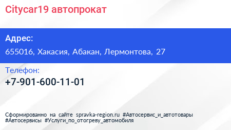 Citycar19, автопрокат по адресу 655016, Хакасия, Абакан, Лермонтова, 27 в дальнейшем Организация, размещена в следующих категориях: