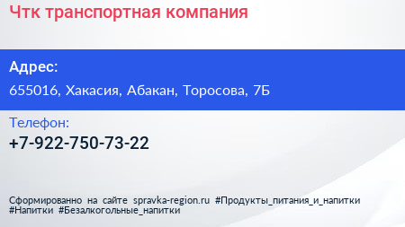 Чтк, транспортная компания по адресу 655016, Хакасия, Абакан, Торосова, 7Б в дальнейшем Организация, размещена в следующих категориях:
