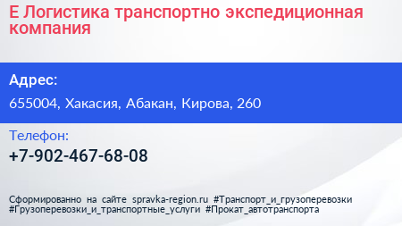 Е-Логистика, транспортно-экспедиционная компания по адресу 655004, Хакасия, Абакан, Кирова, 260 в дальнейшем Организация, размещена в следующих категориях: