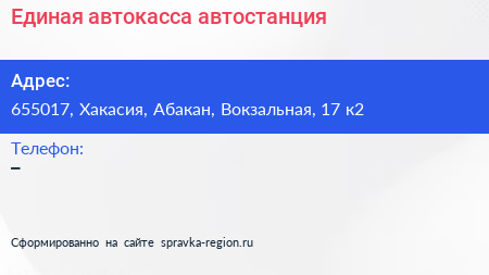 Единая автокасса, автостанция по адресу 655017, Хакасия, Абакан, Вокзальная, 17 к2 в дальнейшем Организация, размещена в следующих категориях: