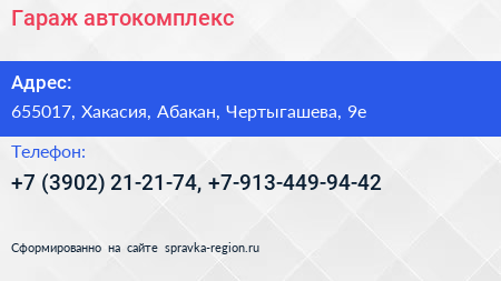 Гараж, автокомплекс по адресу 655017, Хакасия, Абакан, Чертыгашева, 9е в дальнейшем Организация, размещена в следующих категориях: