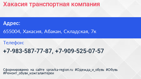 Хакасия, транспортная компания по адресу 655004, Хакасия, Абакан, Складская, 7к в дальнейшем Организация, размещена в следующих категориях: