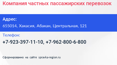 Компания частных пассажирских перевозок по адресу 655014, Хакасия, Абакан, Центральная, 121 в дальнейшем Организация, размещена в следующих категориях: