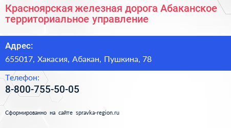 Красноярская железная дорога, Абаканское территориальное управление по адресу 655017, Хакасия, Абакан, Пушкина, 78 в дальнейшем Организация, размещена в следующих категориях: