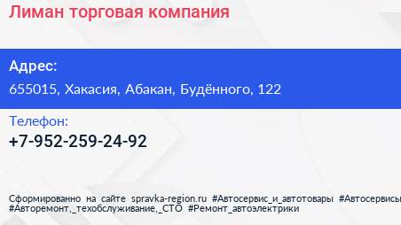 Лиман, торговая компания по адресу 655015, Хакасия, Абакан, Будённого, 122 в дальнейшем Организация, размещена в следующих категориях: